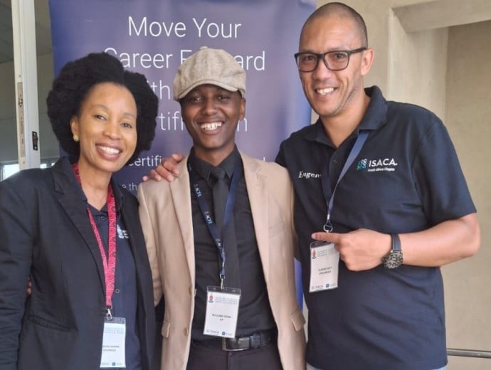 Right image (from left): Thakane Rampai (Senior Lecturer UP), Unathi Sedibe (BCom Honours-Internal Auditing Student), and Eugene May (ISACA Membership & Education Coordinator)