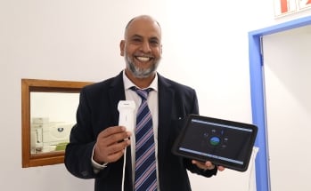 Senior Lecturer and Head of the Clinical Unit (HCU) in Oral and Maxillofacial Radiology, Dr Shaik, holding the portable sonar machine.