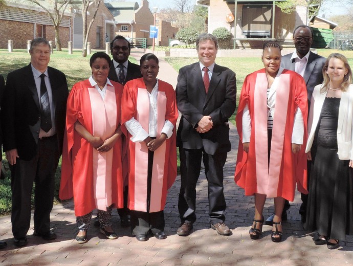 After a warm welcome by the Dean of the Faculty of Veterinary Science, Prof Darrell Abernethy, the newly employed Head of the Department of Veterinary Tropical Diseases, Prof Tshepo Matjila, introduced the supervisors for his department’s graduates, namely Prof Stephen Njiro (Onderstepoort Veterinary Institute – Ms Doboro) and Prof Anita Michel (Ms Gcebe) while Prof Herman Groenewald, Head of the Department of Anatomy and Physiology introduced Ms Makungu for whom he also acted as supervisor.