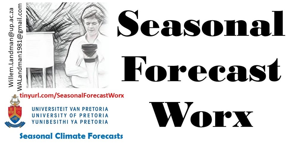 Click here for the latest forecast. The seasonal forecasts presented here by Seasonal Forecast Worx are based on forecast output of the coupled ocean-atmosphere models administered through the North American Multi-Model Ensemble (NMME) prediction experiment (http://www.cpc.ncep.noaa.gov/products/NMME/; Kirtman et al. 2014). NMME real-time seasonal forecast and hindcast (re-forecast) data are obtained from the data library (http://iridl.ldeo.columbia.edu/) of the International Research Institute for Climate and Society (IRI; http://iri.columbia.edu/). NMME forecasts are routinely produced and are statistically improved and tailored for southern Africa and for global sea-surface temperatures by employees and post-graduate students in the Department of Geography, Geoinformatics and Meteorology at the University of Pretoria. Statistical post-processing is performed with the CPT software (http://iri.columbia.edu/our-expertise/climate/tools/cpt/). Click here to download the Oceanic Niño Index (ONI) values in CPT format. For the official seasonal forecast for South Africa, visit the South African Weather Service website at https://www.weathersa.co.za/home/seasonalclimate. |