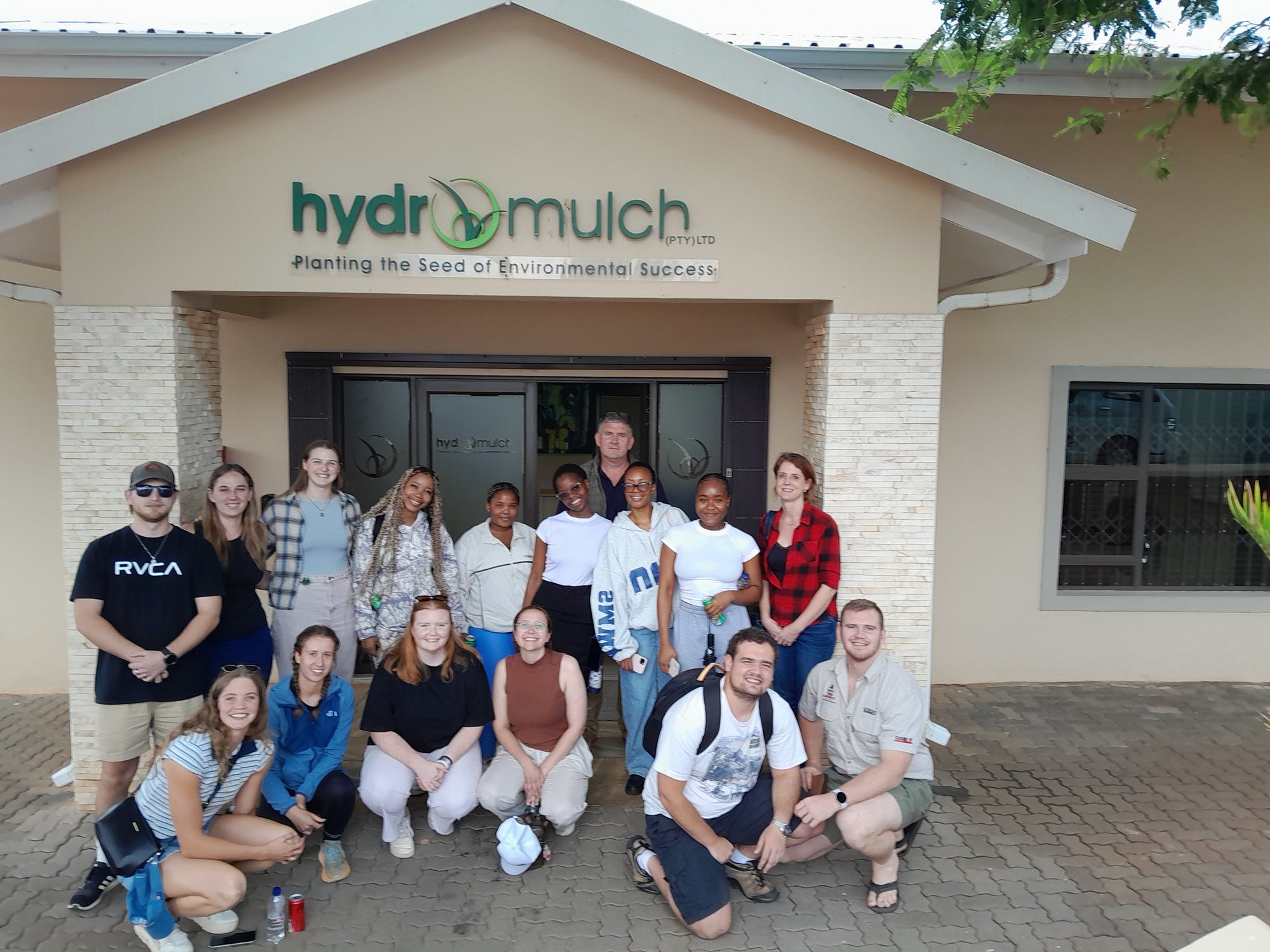 On 30 October, several students from Environmental Geomorphology (GGY 361) undertook a field trip to Hydromulch, a soil rehabilitation company in Kempton Park. The group first learned about cutting-edge "soil-generating" techniques that can be used in the mine rehabilitation industry, as well as the various erosion control measures produced at Hydromulch. Thereafter, we were taken on a tour of the facilities, including the biomat factory and experimental plots, to compare the efficacy of erosion control. This was followed by a demonstration of hydroseeding, a technique used to facilitate the re-establishment of vegetation on slopes. The afternoon was concluded with boerewors rolls and a networking session. The trip introduced the students to industry applications of the theoretical work that they have learned about, and gave them a glimpse into their potential future working lives.