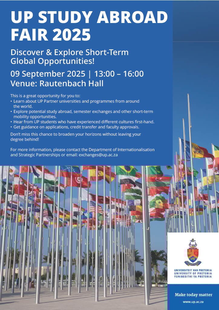 Study Abroad (Outbound), also known as free movers, refers to students going to institutions with which the University of Pretoria does not have a collaboration agreement or students who go to partner institutions but are over the quota specified in the agreement.