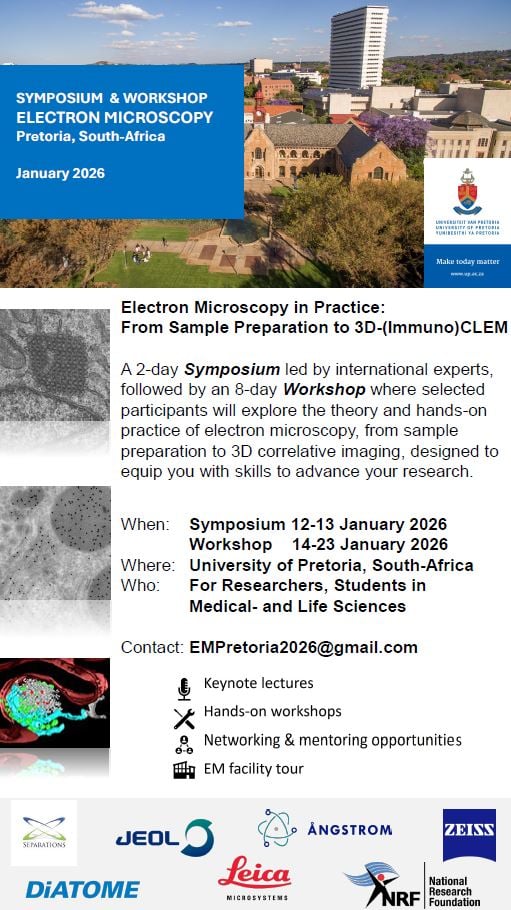 Electron Microscopy in Practice: From Sample Preparation to 3D-(Immuno)CLEM A 2-day Symposium led by international experts, followed by an 8-day Workshop where selected participants will explore the theory and hands-on practice of electron microscopy, from sample preparation to 3D correlative imaging, designed to equip you with skills to advance your research. When: Symposium 12-13 January 2026 Workshop 14-23 January 2026 Where: University of Pretoria, South-Africa Who: For Researchers, Students in Medical- and Life Sciences Contact: [email protected]