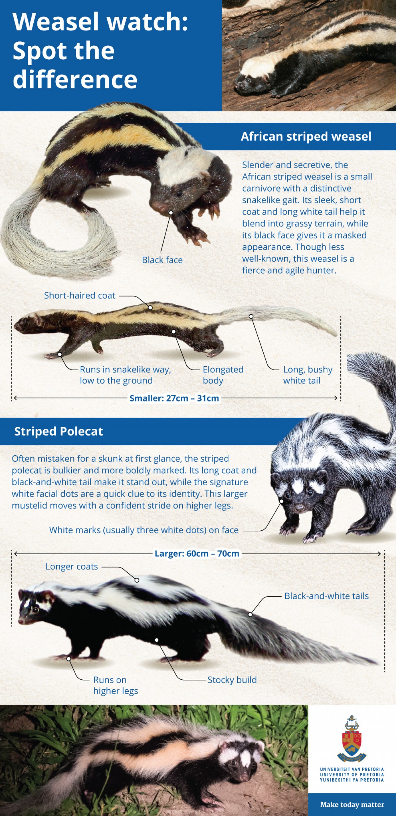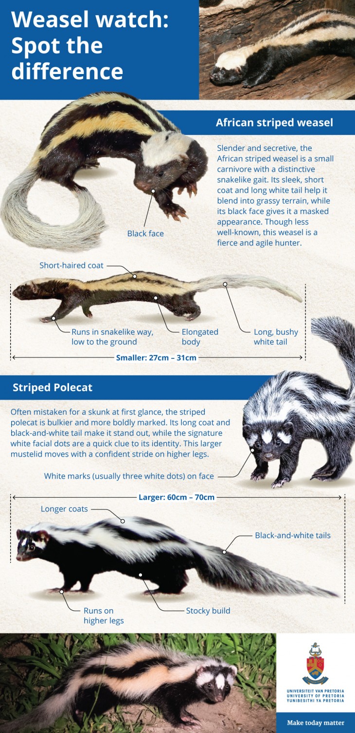 The African striped weasel (Poecilogale albinucha) and the African polecat (Ictonyx striatus) may look alike at first glance, but these fascinating African mammals differ in their markings, size, and behaviour. This infographic can guide you to identify the wildlife by highlighting the key differences between the two species, so you can recognise each animal.