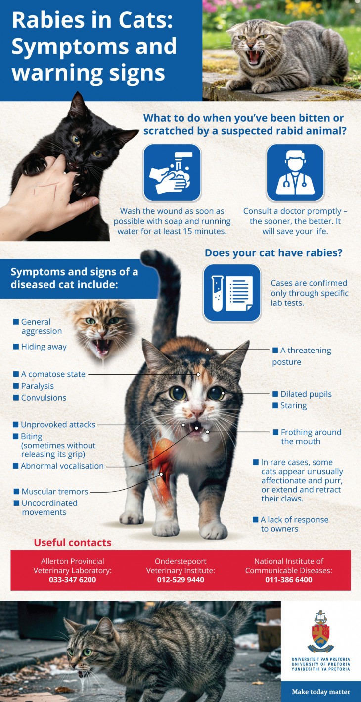 Infected cats excrete the rabies virus in their saliva for several days before symptoms kick in. A bite or scratch from a cat can leave deep puncture wounds, through which the virus can enter a person’s bloodstream. Learn more about other possible symptoms of rabies in cats and what to do if you suspect your cat may be infected.
