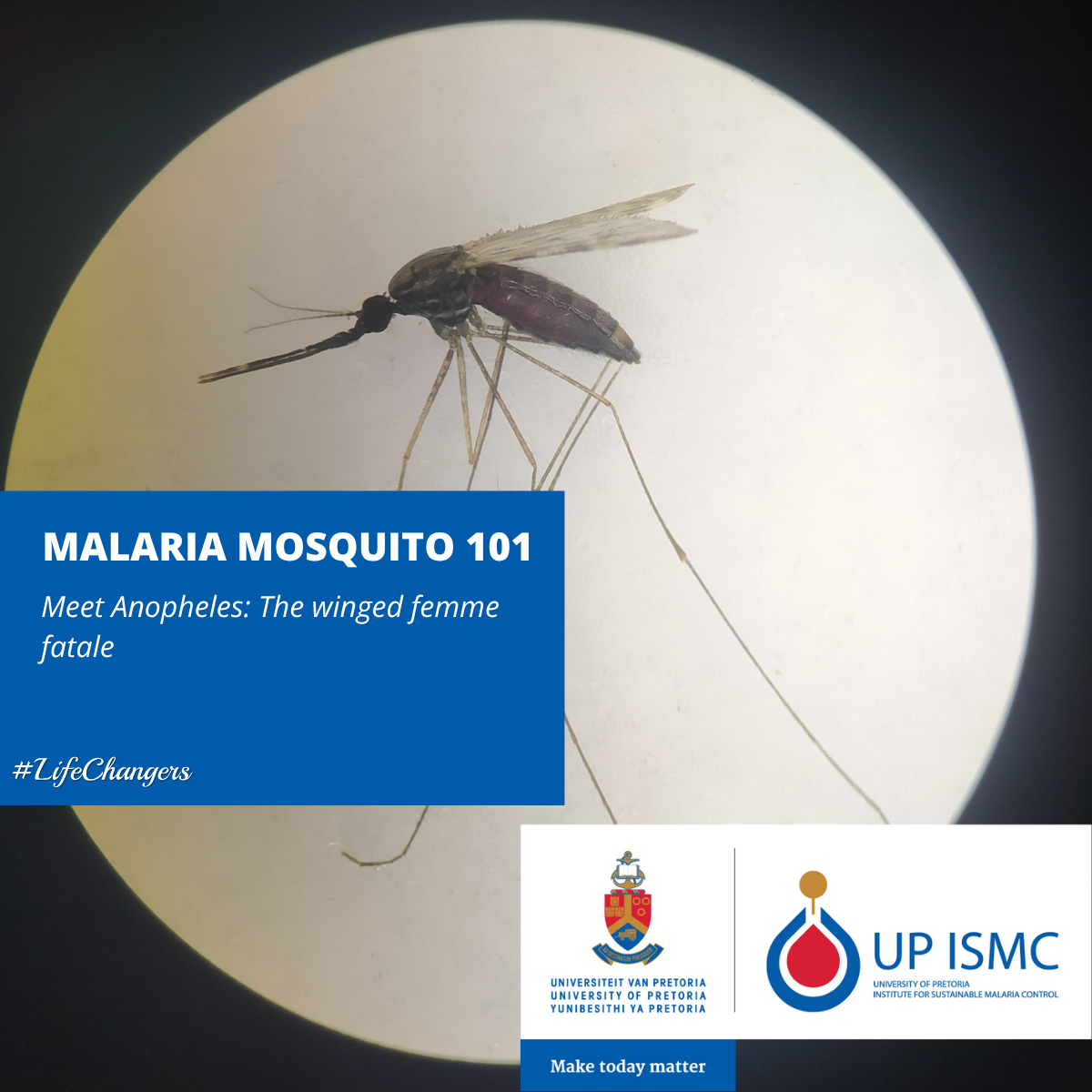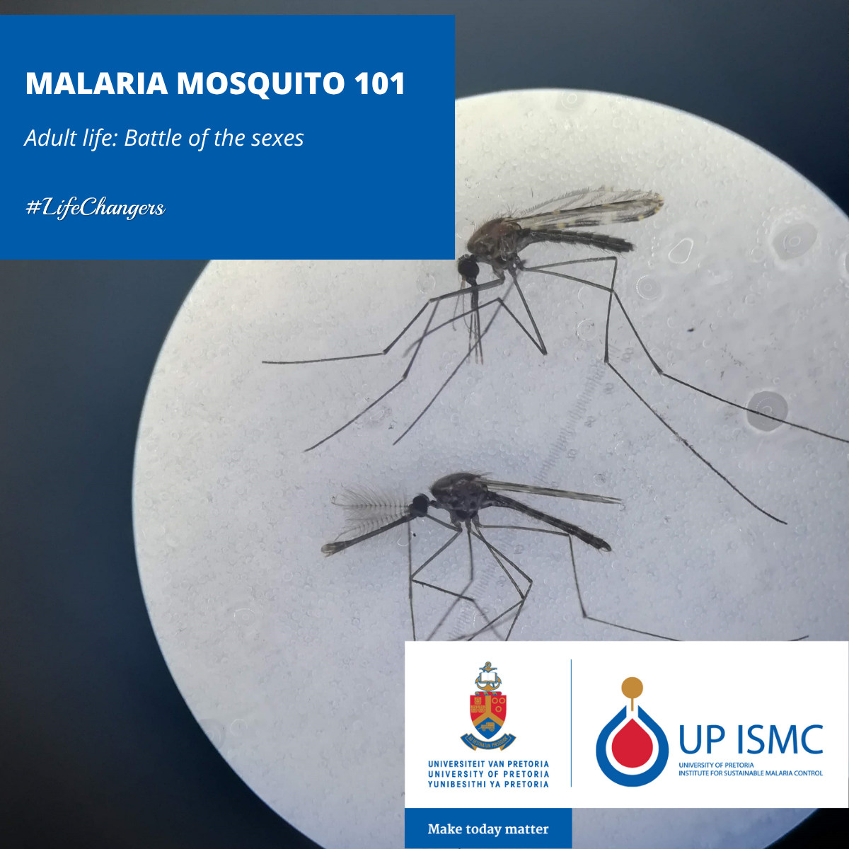 Image: Female (top) and male (bottom) Anopheles arabiensis mosquitoes under microscope - Source: UP ISMC. Credit. Megan Riddin.
